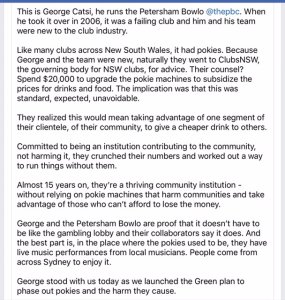An encouraging story my wife found on FB; she’s a keen bowler and our club only has a few pokies, hidden away. Some clubs we’ve been to are depressing places, probably because their glitzy upgrades are paid for by poor gambling addicts. The Petersham Bowlo has found a way to cast off the tentacles of this evil industry: -
