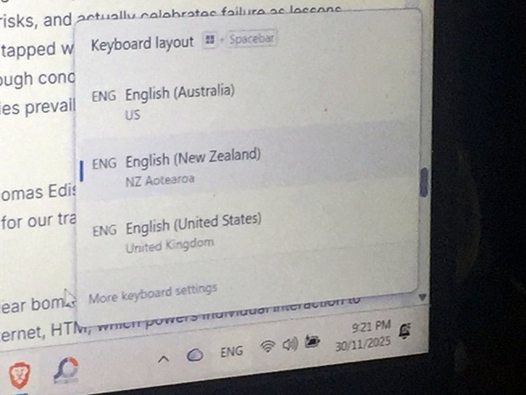 When I click on the language indicator (ENG) on my task bar, the pop-up menu shows 3 options. ENGLISH AUSTRALIA with a sublabel US, English New Zealand (NZ Aotearoa) and United States (United Kingdom). Regardless of which option I choose, it highlights words such as colour until I remove the U. -