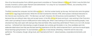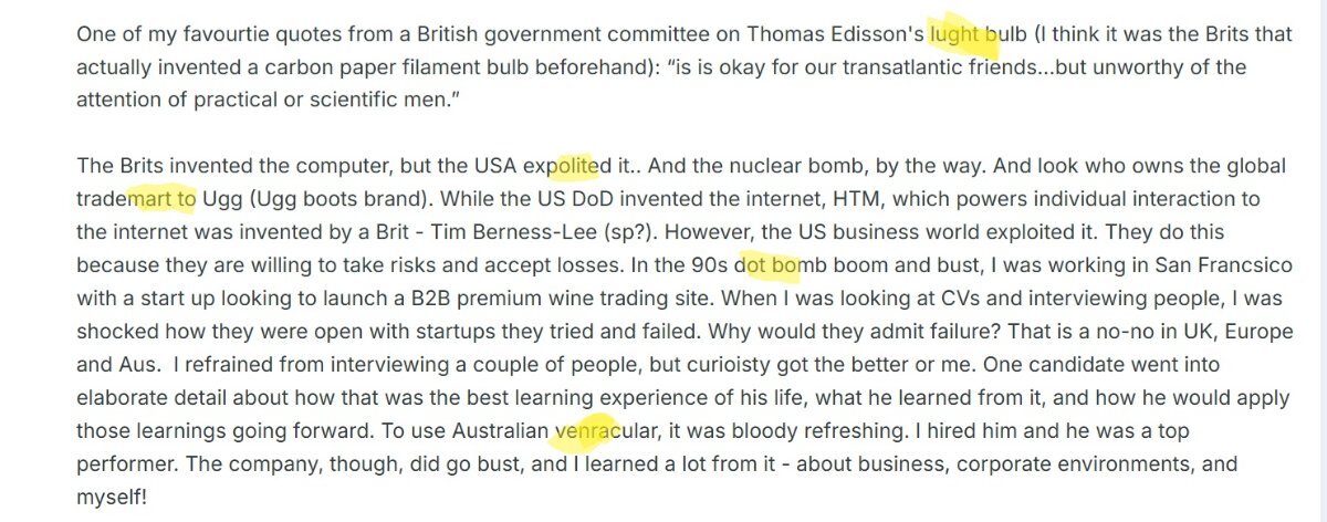 a) it's not mystical (I think you mean mythical), and b) they are often set automatically at installation time based on your computer's locaisation settings.. So. no need to apologise. Ahh.. yes.. the difference between TV and the internet is you have total choice about the your content consumption, whether you consume it at all, and about content creation. Unlike TV, which is governed by execs, the Internet has totally democratised content.. Of course, it's a furphy to say you have a choice whethe to use the internet or not, as, after all, even doing govenment business like a class 2 medical requires the internet and a app - as I found out on Thursday. But you have total choice about what you consume.. and if you like, you can produce content and make a decent living from it as well. The reason for Americanisation (or should I spell Americanization) globally isn't a simple, "oh, we are force fed US content", The reality is the far more complex than that. America has a much stronger entrepreneurial culture than much ofd the rest of the world. What this means is that the US tolerates a greater degree of risks, and actually celebrates failure as lessons learned rather than failure itself. And, in it's entrepreneurial spirit, it has tapped well into consumerism as and expanded globally. But this is not unique to America. Europe did it beforehand through conolisation, as did the Ottomans, and the Romans. At different times of humanity, cultures of the dominant societies prevailed, although these days, thanks to technology, it is easier to do. One of my favourtie quotes from a British government committee on Thomas Edisson's lught bulb (I think it was the Brits that actually invented a carbon paper filament bulb beforehand): “is is okay for our transatlantic friends…but unworthy of the attention of practical or scientific men.” The Brits invented the computer, but the USA expolited it.. And the nuclear bomb, by the way. And look who owns the global trademart to Ugg (Ugg boots brand). While the US DoD invented the internet, HTM, which powers individual interaction to the internet was invented by a Brit - Tim Berness-Lee (sp?). However, the US business world exploited it. They do this because they are willing to take risks and accept losses. In the 90s dot bomb boom and bust, I was working in San Francsico with a start up looking to launch a B2B premium wine trading site. When I was looking at CVs and interviewing people, I was shocked how they were open with startups they tried and failed. Why would they admit failure? That is a no-no in UK, Europe and Aus. I refrained from interviewing a couple of people, but curioisty got the better or me. One candidate went into elaborate detail about how that was the best learning experience of his life, what he learned from it, and how he would apply those learnings going forward. To use Australian venracular, it was bloody refreshing. I hired him and he was a top performer. The company, though, did go bust, and I learned a lot from it - about business, corporate environments, and myself! And the US is the biggest consumer market in the world. So, while yyou may not be American making content, you want to attract the market likely to make you most money: (made specifically for the US.. but a strangely familiar accent). The reality is you can moan about it, but even if the pollies did tryt something, the sheer juggernaut is off and going, and there is little they can do about it. Of course, rather than moaning, you can start your own content to correct the issue and bring Aussie culture to the world.. You know, like Bluey, Neighobours, and the Aussie travelling spirit. When I first arrivedi in the UK, I was surprised at how well adopted some Aussie vernacular was - such as shocker, She'll be right, mate (mate being English; Cobbah being Aussie, but mate being predominant in Australia, too). In other words moaning about it and to you dear One Nation friends aboujt it is pushing ship uphill, or as we used to say, you'll be up ship creek in a barbed wire canoe. -