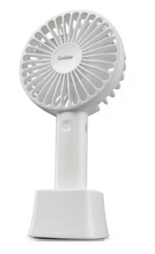 This is the fan I bought, only mine is black. About 9 inches high. $14. 3 speeds. Keeps the face and neck nice and cool. Rechargeable battery, plugs into a USB port or charger.