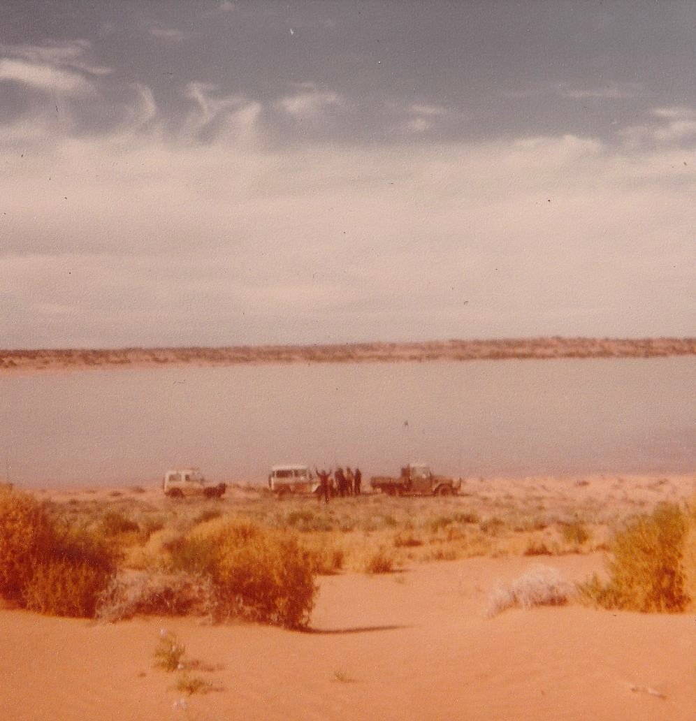 This 1982 photo shows the Simpson Desert the driest I've ever seen it. The only vegetation visible from the air was the shrubs and trees, no grass to be seen. The drought broke the following year with a lot of flooding. The photo is taken from a Cherokee Six just entering the Simpson from the east en route from Windorah to Alice Springs. Everything went ok until halfway across when the alternator died and the battery went flat, so no radio or instruments, just the compass. We landed on the strip at Ringwood Station on the western edge of the desert, and luckily the station owner was home to see us come in. He drove over and picked up the pilot so he could use the station radio to call Alice Springs airport to clear a space for us to fly into there, being pre satellite days when the stations relied on HF radio for communications. We got to stay overnight in Alice waiting on the new alternator to be fitted, then on to Bililuna in W.A. the next day. Another surprise there on landing - the client (Shell if my memory is correct) had given the crew three days off as the Halls Creek annual races were on. We took off again to Halls Creek which took us straight past the Wolfe Creek crater, so that was a good sight from the air. It was a memorable trip for different reasons. When the battery went dead over the Simpson, it really got us thinking how little preparation we had in regard to survival gear if we had to put down in a dune corridor. We didn't even have near enough water required to stay on the ground any length of time. As a comparison of seasons, I took these photos with a digital compact camera in the Simpson in 2010 after an extended wet period. Most of the green you can see is grass and herbage that burns off with hot, dry conditions. It was very different to the other deserts I've been in which have more permanent vegetation in the dune corridors, and much more spinifex. Edit: Just as a post script, it wasn't far from where these three photos were taken that I came across an old survey marker peg that was the site of Geosurveys Base Camp #1 from Reg Spriggs' first motorised crossing of the desert in 1962.