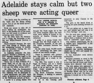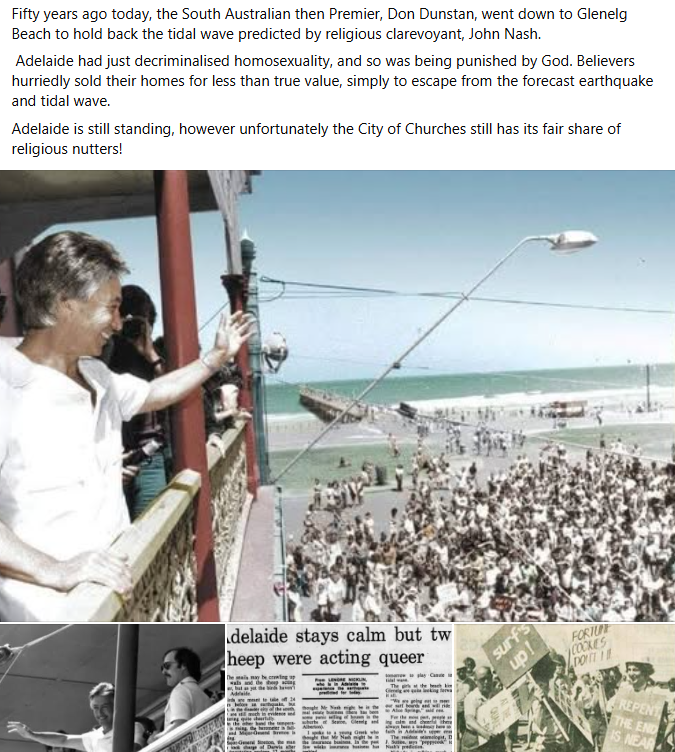 I was just reminded by an article about an event 50 years ago today. I was growing up in Adelaide, and I was 13 years old. The Dunstan government had just decriminalised homosexuality, being the first state to do so. A religious nutter who claimed to be a clairvoyant predicted that this would cause a tidal wave on this day at midday, and it would wipe out Adelaide. Although apparently some took it seriously, a few sold their houses and moved, it was mostly treated a little more lightheartedly. Some workers turned up to their jobs in flippers and floaties. I can remember "I survived the Adelaide tidal wave" T-shirts. The Premier, the colourful Don Dunstan, stood on a balcony at Glenelg saying if the tidal wave came, he would turn it back.