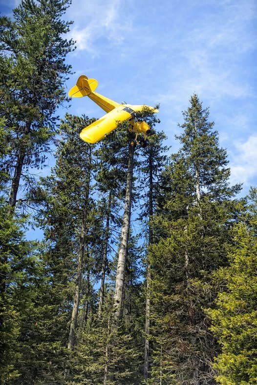 Pilot John Gregory crashed into the tree near McCall, Idaho, in April 2019, when he was attempting a forced landing in a nearby field. He was uninjured, and was rescued by a volunteer firefighter who also owns a tree removal business. That'd be some rescue! https://www.seattletimes.com/seattle-news/northwest/pilot-rescued-after-plane-crashes-atop-tree/#:~:text=Pilot John Gregory was not hurt in,department in the resort town of McCall.