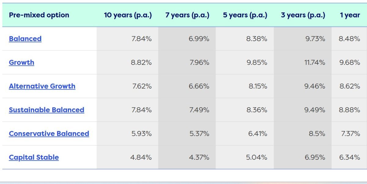 SWMBO has her super invested with Telstra Super, because she worked for them for a while. The return on this fund is impressive, more than 7% on average, over the last 20 years.That period includes the disastrous GFC and the pandemic period, as well as a couple of other financial shocks. Interestingly, Telstra Super have a fairly even balance of Australian and U.S. shareholdings. The managers continually revise their investments. The major thing with Telstra Super is that profits are returned to Super Fund holders, not to already-wealthy private shareholders, as many Super Funds do. Telstra Super has won awards as the Fund with the best performance for the last 18 years. SWMBO draws out 5% a year (the minimum) and the level of funds she's got, just keeps on increasing, despite the drawdown.1 point