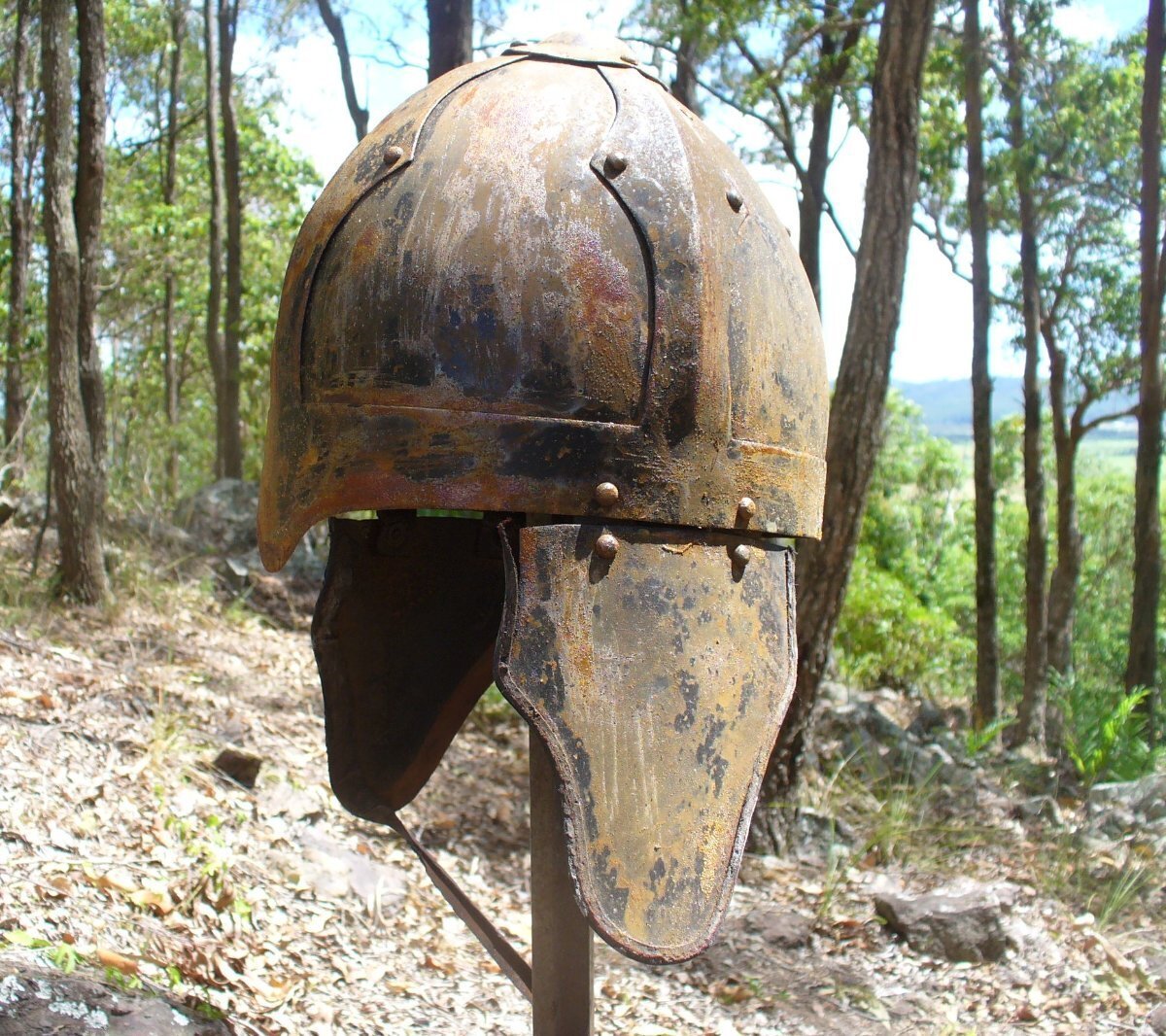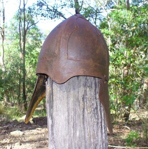 Just a Ratbikehelm update: since posting the original photo of it (second photo), it's had regular applications of a salt and vinegar solution for a couple of weeks, followed by leaving it out in the 230mm of rain we recently had. In this updated photo it's had a couple of applications of lanox. I might give it a couple more to get well and truly into the crevices. When it's all nice and dry and cured, it will get a coat of home made beeswax polish and a light burnish. Then all it needs is the ear flap leather trim put back on. At some time in the future I'll make an inner support so it can sit on a head.3 points