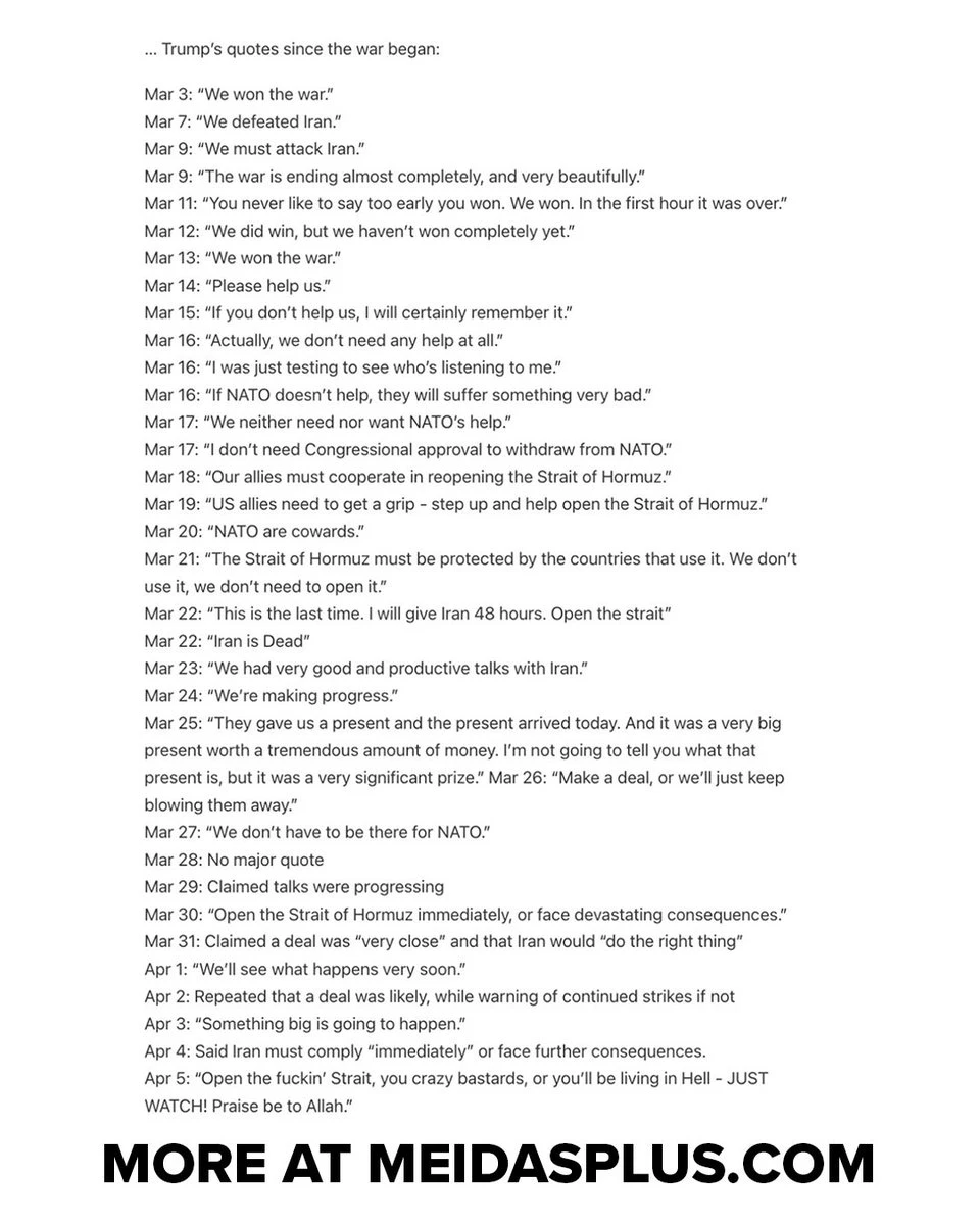 https://newrepublic.com/article/208580/transcript-trump-war-tirade-backfires-gop-panics-what-hell Yeah, I know it's from a lefty echo chamber, but there are a couple of good quotes. Re: DT's recent 'speech' about The Iran Situation: Apart from saying that the Strait of Hotmus will open up naturally one day.... "He thinks he’s Superman. And of course, that’s fine when you jump off the building. It’s just a problem when you hit the ground."