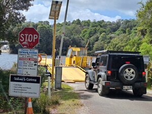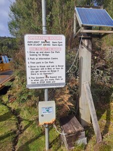 Waiting for a barge to take us across the river.... Then we had to read all the signs..... The important information was the faded marker pen writing on the grey packing tape at the bottom