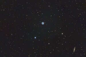 Owl Nebula... the galaxy nearby at lower right right is just known as NGC3556. Owl Nebula is 2600 Light Years distant, and the galaxy is 46 Million Light Years from us, . . ( approximately ) Pic by Rob Greaves 09 / 04 / 2020 The Owl Nebula is a planetary nebula located approximately 2,030 light years away in the constellation Ursa Major. It was discovered by French astronomer Pierre Méchain on February 16, 1781. When William Parsons, 3rd Earl of Rosse, observed the nebula in 1848, his hand-drawn illustration resembled an owl's head. Wikipedia Magnitude: 9.9 Radius: 0.91378 light years Distance to Earth: 2,600 light years Coordinates: RA 11h 14m 48s | Dec +55° 1′ 0″ Distance: 2,030 ly (621 pc); 2,800 ly (870 pc) ly Constellation: Ursa Major Apparent dimensions (V): 3′.4 × 3′.3
