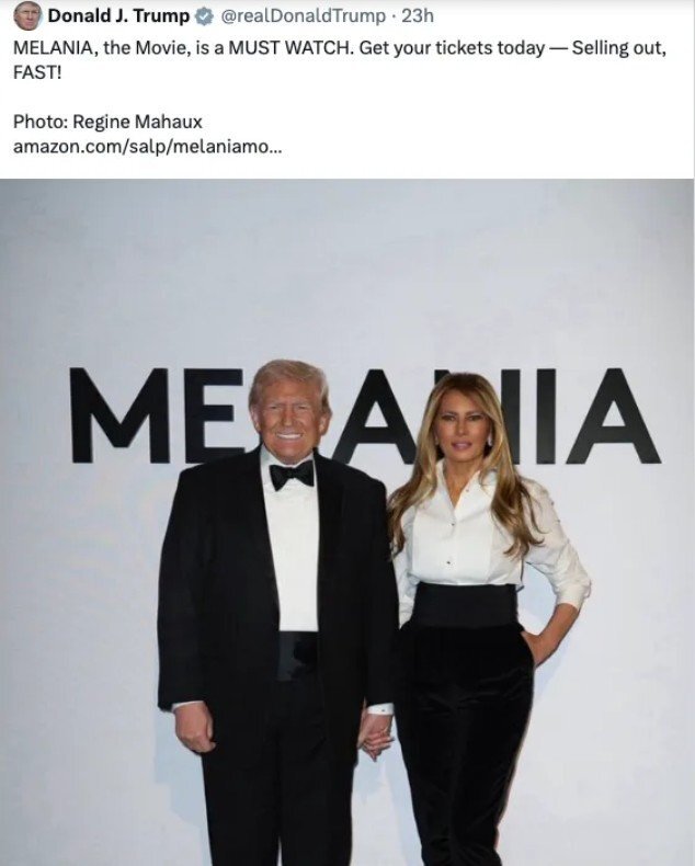 Trump is promoting the Melania movie "....Selling out, fast" One the opening night, a number of theatres reported not a single ticket sold. Others reported less than ten. And it's getting rave reviews on social media... I'd rather poke my eyes out with a burnt stick. If they showed this on a plane, people would walk out. As someone said, "It's all about ME."