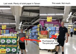 Made a meager living selling exercise equipment for 35 years. Finally I’m in the right industry! Update today on the toilet paper crisis. It’s arrived in Taiwan. I buy all the pink jelly balls so it’s no surprise they are always gone. Didn’t expect the toilet paper thing here.