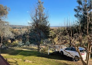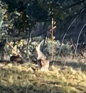 This is mine a moment ago: A family of Wallaroos on our lawn. The white building 12km away is the old Bondi Tram terminal, relocated, reclad and repurposed as a farm shed. The low 35 away is Breeza Mt.