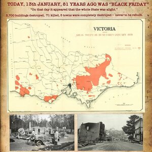 81 Years ago 13th JANUARY, 81 YEARS AGO WAS KNOWN AS ‘BLACK FRIDAY’ On this day, Eighty-one years ago (13th Jan 1939) with temperatures above 110°F (45°C) across Victoria and the state in drought, bushfires consumed 3,700 buildings across the state, 71 lives were lost and 5 towns completely destroyed- never to be rebuilt. The Royal Commission into ‘’Black Friday’’ concluded; “There had been no fires to equal these in destructiveness or intensity in the history of settlement in this State, except perhaps the fires of 1851, which, too, came at summer culmination of a long drought. ‘’At midday, in many places, it was dark as night. Men carrying hurricane lamps, worked to make safe their families and belongings Travellers on the highways were trapped by fires or blazing fallen trees, and perished. Throughout the land there was daytime darkness’.’ “The speed of the fires was appalling. They leaped from mountain peak to mountain peak, or far out into the lower country, lighting the forests 6 or 7 miles in advance of the main fires. Blown by a wind of great force, they roared as they travelled. Balls of crackling fire sped at a great pace in advance of the fires, consuming with a roaring, explosive noise, all that they touched.‘’ ‘’On that day it appeared that the whole State was alight.” [ATTACH]50602._xfImport[/ATTACH] [ATTACH]50603._xfImport[/ATTACH]