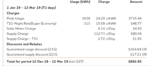 In metro QLD basically if the electricity is running past your house it doesnt matter if you pull your service down or disconnect from the mains you get charged the access fee its a day rate borks out about $120 a quarter. You can see mine is 112 cents per day plus the solar meter charge etc...pricks. Its the same as the water rates here ..you can disconnect or not use the mains water but they charge you about the same because town water runs past your house [ATTACH]50040._xfImport[/ATTACH] -